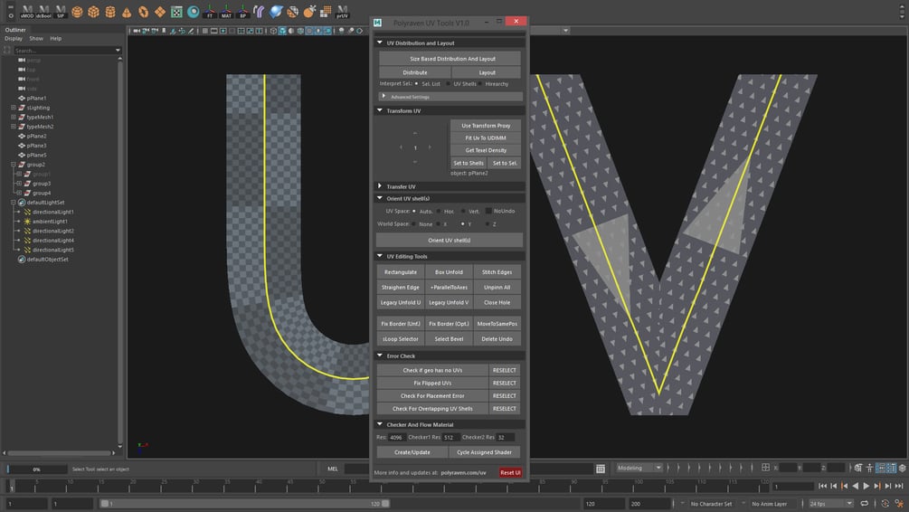 Polyraven UV tools is a MEL script for MAYA*, which makes it easier to unwrap hardsurface geometries, and much faster to deal with the distribution and layout of the UV shells. It includes checker materials, and error checking functions, which can relatively quickly find: flipped, overlapping, incorrectly positioned and missing UVs. And many more things. Find out more at: https://www.polyraven.com/uv/